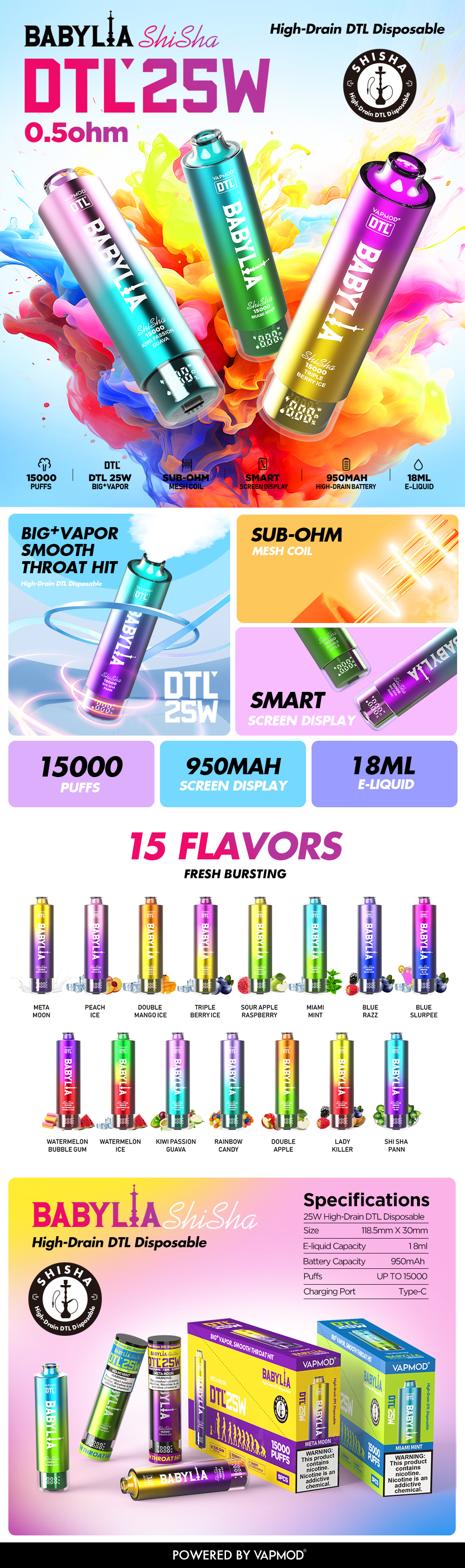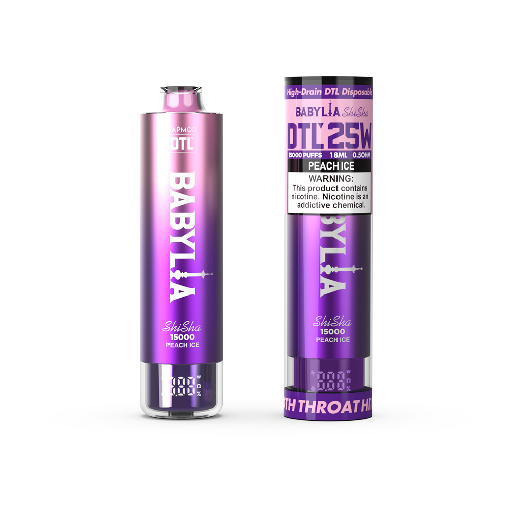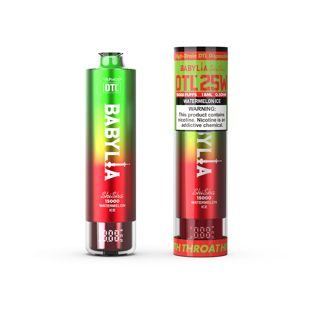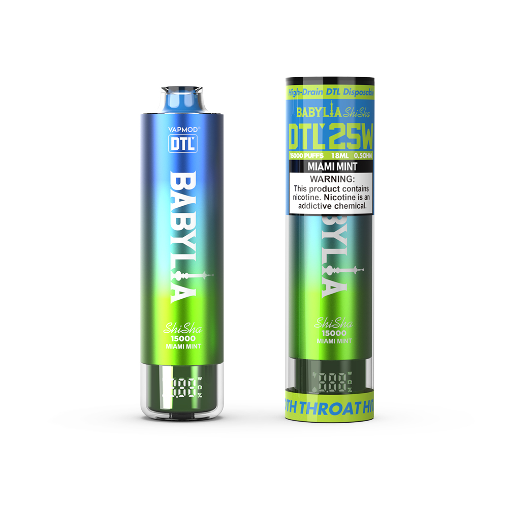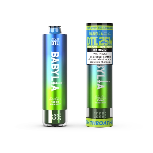The Vapmod Babylia 15000, a high-drain DTL shisha style vape is designed for direct-to-lung vaping enthusiasts. It equipped with a 0.5 ohm mesh coil , operating at 25W for optimal vapor production and flavor. Its digital screen display allows for easy monitoring of settings and battery life . With a robust 950 mAh battery, it ensures reliability and endurance throughout the day.