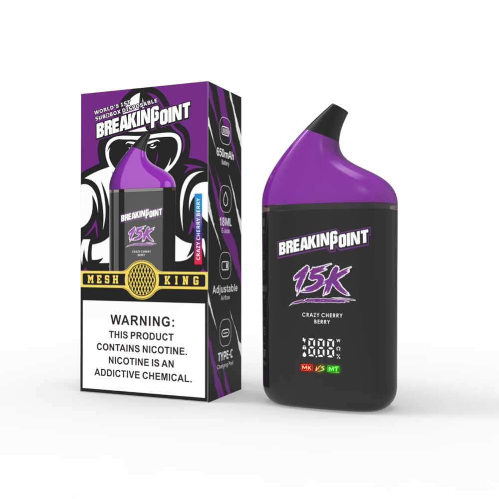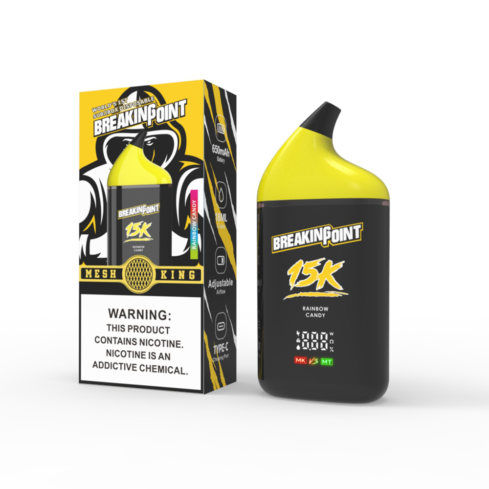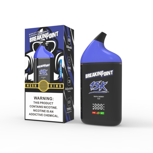The Meshking Breakingpoint 15K ,a subΩ box disposable vape ,delivers extreme authentic tastes and power oupout more than ever.It features 18ml e-liquid capacity and 650 mAh rechargeable battery to meet your need both for durability and consistency.It has unique shape shell with boxing elements and digital display screen provides real-time information about the battery and liquid levels .